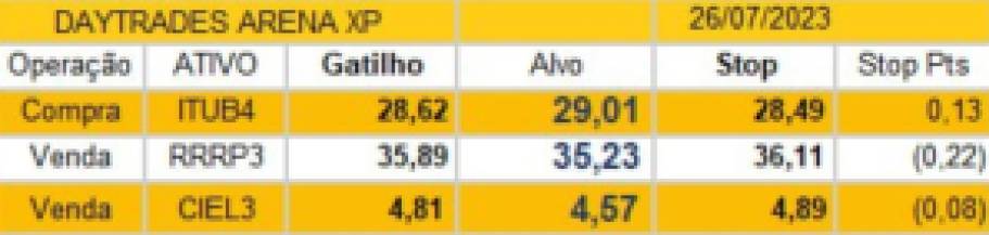 | Ativo | Dia (%) | Valor (R$) | Variação (R$) | Negócios | Semana (%) | Julho (%) | 2023 (%) | |