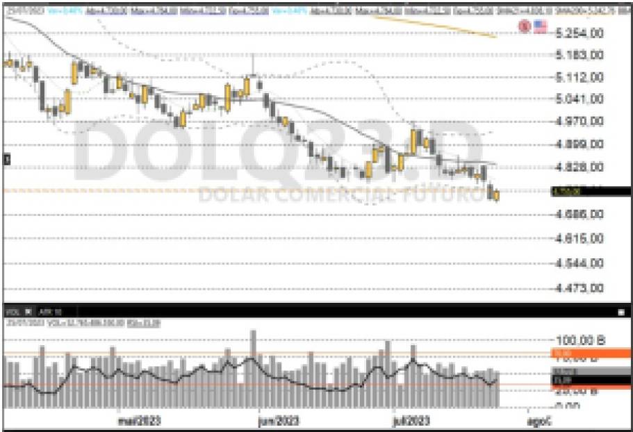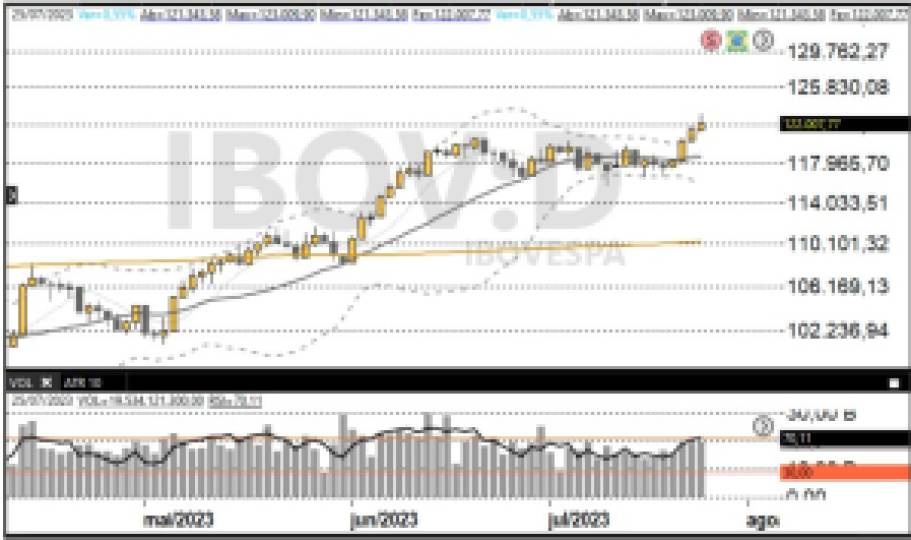 Ibovespa Futuro fecha com alta de 0,27%, aos 123.200 pontos; e dólar futuro, com queda de 0,26%, a R$ 4,7425