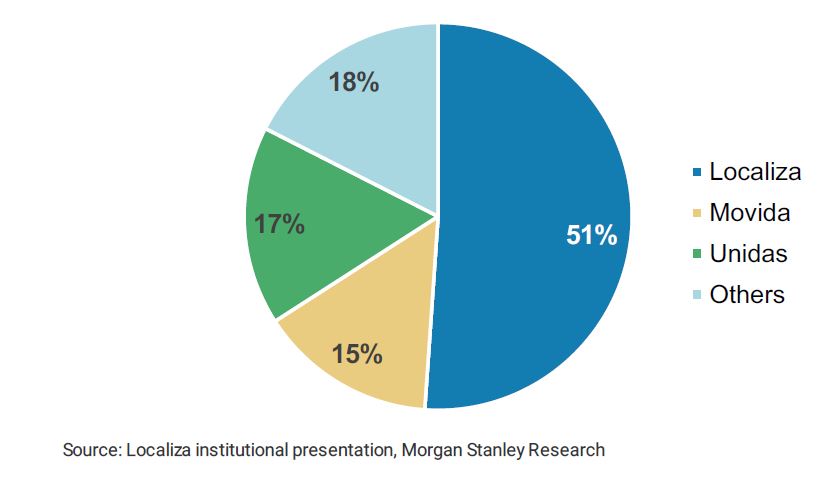 No segmento de aluguel de carros, a Localiza atualmente tem cerca de 51% de participação, enquanto a Unidas tem uma fatia de 17%, totalizando 68% do mercado. Do lado de gestão de frota, as respectivas participações de mercado das empresas são de 13% e 16%, resultando em 29% combinados.