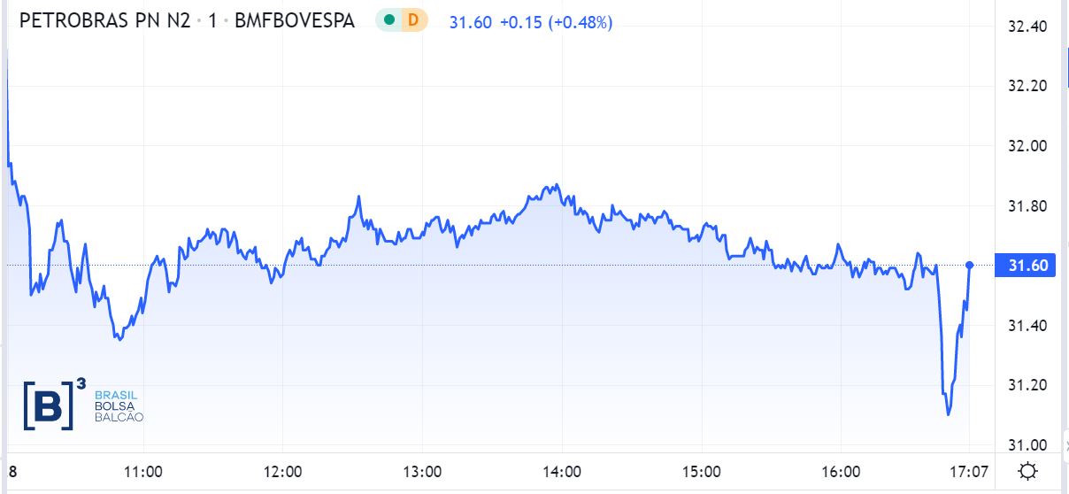 Na mínima do dia, os papéis PETR4 chegaram a cair 4,09%, a R$ 30,98; contudo, nos minutos seguintes, as ações se recuperaram, ainda que fechando em queda de 2,17%, a R$ 31,60.