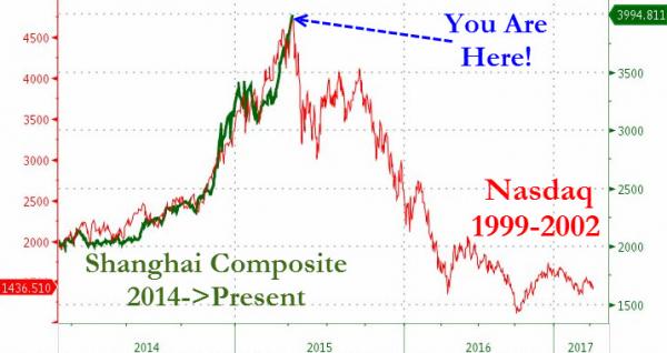 Para quem quer ver o que pode resultar dessa disparada sem fundamento da Bolsa chinesa, confira abaixo o gráfico elaborado pelo site americano Zero Hedge, que mostra o índice da Bolsa de Xangai em uma trajetória idêntica à que antecedeu a Bolha da Nasdaq.