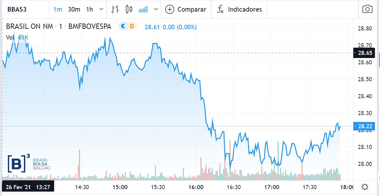 Vale destacar que os papéis BBAS3, que já registravam uma certa volatilidade durante a sessão, intensificaram as perdas um pouco antes das 16h, quando foi publicada a notícia. Confira no gráfico abaixo: