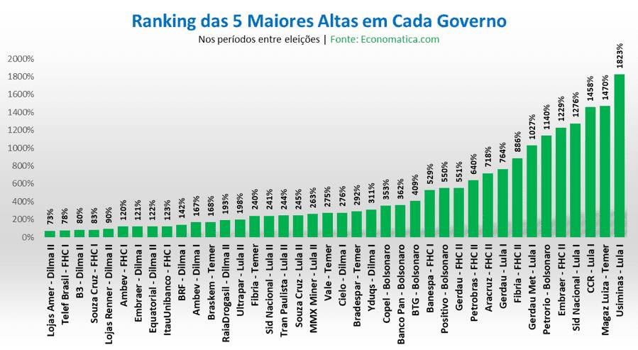 No geral, levando em conta desde Fernando Henrique Cardoso até o atual governo de Jair Bolsonaro, o topo do ranking é da Usiminas no governo Lula I, sendo seguida por Magazine Luiza MGLU3 (1.470%) no governo Temer, por CCR (1.458%) e CSN (1.276%) no Lula I, pela Embraer (1.229%) no FHC II, pela PetroRio, hoje PRIO PRIO3 (1.229%) no Bolsonaro e pela Metalúrgica Gerdau (1.027%) no Lula I, todas com mais de 1.000% de valorização.
