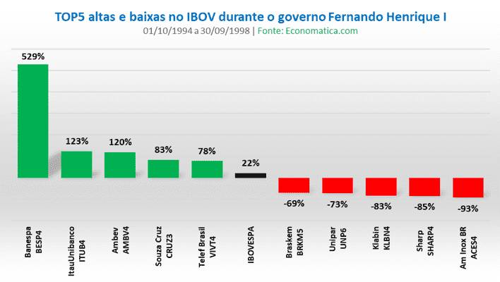 O Banespa (529%) foi a ação com maior valorização nos primeiros quatro anos de governo do FHC, com o top 5 ainda contando com Itaú Unibanco ITUB4 (123%), Ambev (120%) com o ticker AMBV4, Souza Cruz (83%) e Telefônica Brasil, então VIVT4 (78%). O Ibovespa subiu 22% no período.