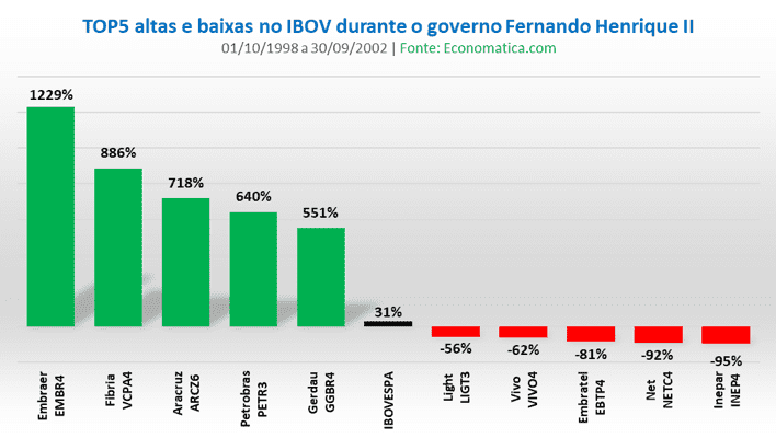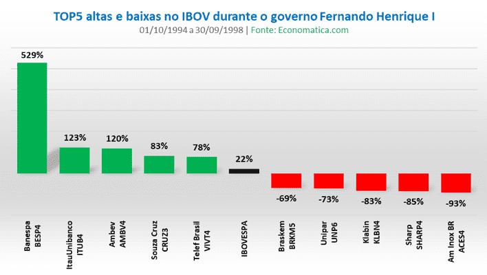 O Banespa (529%) foi a ação com maior valorização nos primeiros quatro anos de governo do FHC, com o top 5 ainda contando com Itaú Unibanco ITUB4 (123%), Ambev (120%) com o ticker AMBV4, Souza Cruz (83%) e Telefônica Brasil, então VIVT4 (78%). O Ibovespa subiu 22% no período.