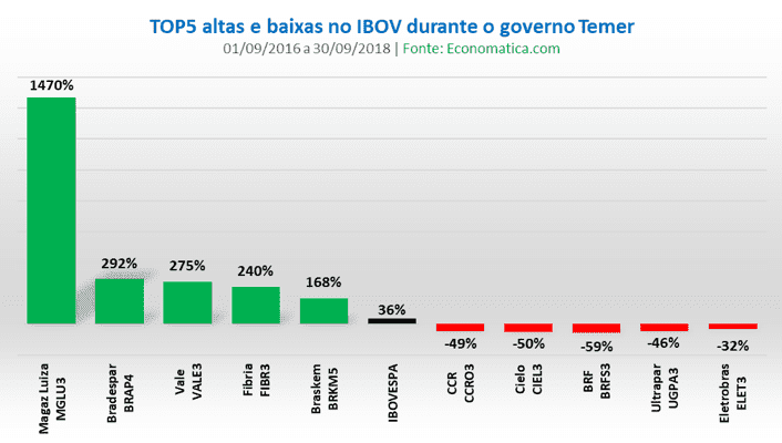 Durante o governo de Michel Temer, período em que o Ibovespa subiu 36%, as maiores ganhadoras de valor foram Magazine Luiza MGLU3 (1.470%), Bradespar BRAP4 (292%), Vale VALE3 (275%), Fibria (240%) e Braskem BRKM5 (168%).