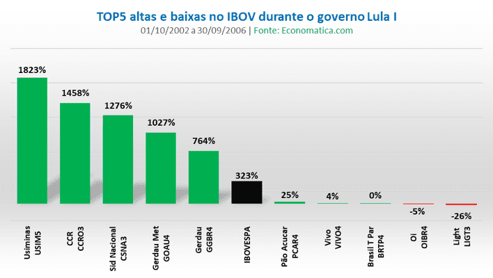 Entre 1 de outubro de 2002 e 30 de setembro de 2006, considerado o Lula I pelo levantamento, o Ibovespa saltou 323%. A maior alta foi da siderúrgica Usiminas USIM5 (1.823%), seguida de CCR CCRO3 (1.458%), CSN CSNA3 (1.276%), Metalúrgica Gerdau GOAU4 (1.027%) e Gerdau GGBR4 (764%). Assim, as siderúrgicas foram o grande destaque no primeiro governo Lula.