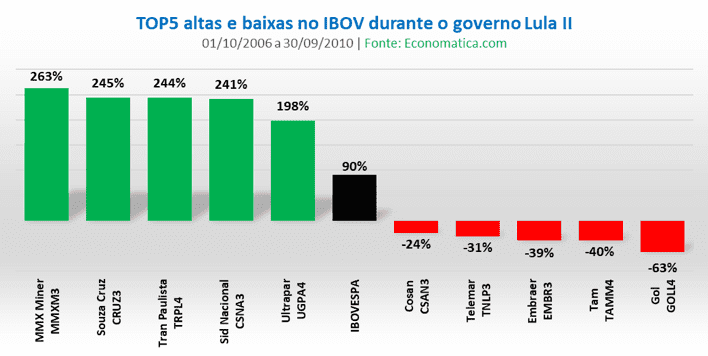Já no Lula II, que abrange o período entre 1 de outubro de 2006 e 30 de setembro de 2010, os ganhos foram menores, com o Ibovespa subindo 90% no período. Curiosamente a MMX, hoje em situação bastante complicada, subiu 263%, seguida de Souza Cruz (245%), que fechou capital em 2015. Transmissão Paulista TRPL4 (244%), CSN (241%) e Ultrapar UGPA3 (198%) aparecem na sequência.