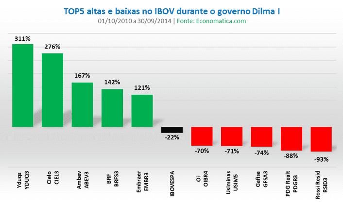 No Dilma I as maiores altas foram das ações da Yduqs YDUQ3 (311%), em um período em que as educacionais foram destaque com os programas de financiamento estudantil, sendo seguidas por Cielo CIEL3 (276%), Ambev ABEV3 (167%), BRF BRFS3 (142%) e Embraer (121%). Isso em um período em que o Ibovespa registrou queda de 22%.