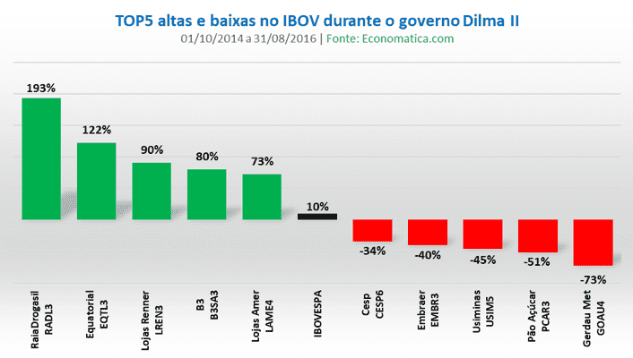 Já durante o período de 1 ano e 8 meses do segundo mandato de Dilma, o Ibovespa subiu 10%, sendo que as maiores altas foram de RaiaDrogasil, agora RD RADL3 (193%), Equatorial EQTL3 (122%), Lojas Renner LREN3 (90%), B3 B3SA3 (80%) e Lojas Americanas (73%), sendo que a última ainda negociava com o ticker LAME4.