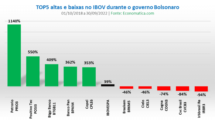 Por fim, no governo mais recente, de Jair Bolsonaro, as maiores ganhadoras de valor foram PetroRio, atual PRIO (1.140%), Positivo POSI3 (550%), BTG (409%), Banco Pan BPAN4 (362%) e Copel CPLE6 (353%). Nesse período, o Ibovespa acumulou alta de 39%.