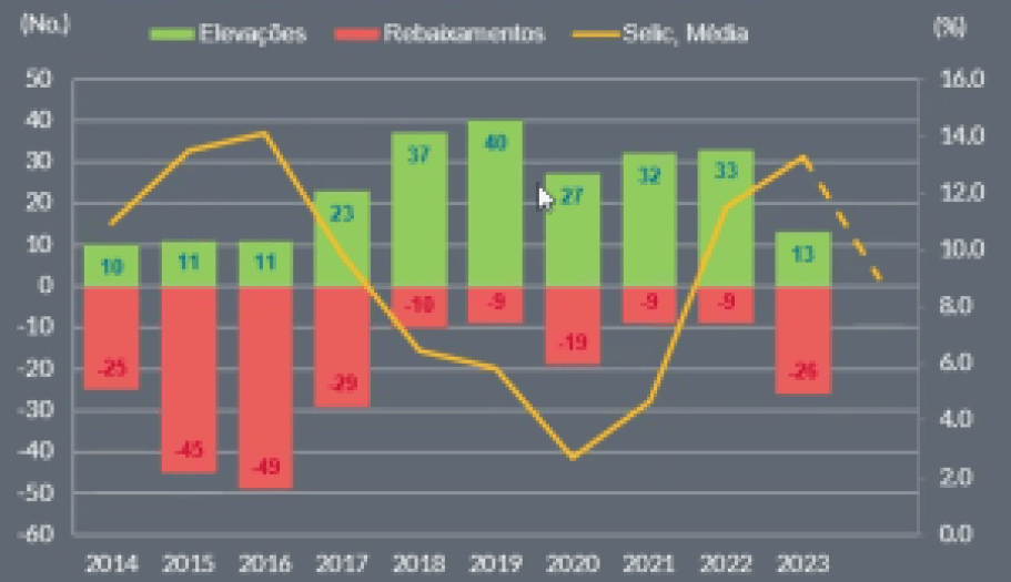Fora o fator pontual da recuperação judicial de Americanas, esse quadro é extremamente correlacionado com a taxa Selic. Como se vê abaixo, quando os juros sobem, se elevam os rebaixamentos de ratings.