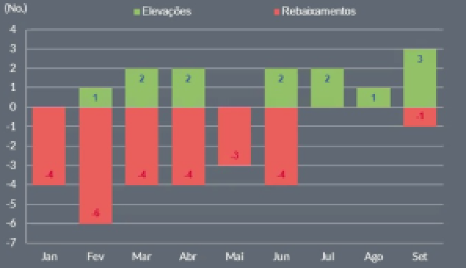 Nesse contexto, este ano deve se configurar como o pior ano em termos de rebaixamento de ratings, por parte da Fitch, desde 2017, estima Carvalho, com dados até setembro.