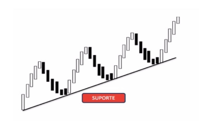 Segundo o especialista, para traçar uma linha de tendência de alta, basta ligar os “fundos”, os pontos mais baixos de um gráfico, para evidenciar a tendência de alta conforme demonstrado na imagem abaixo: