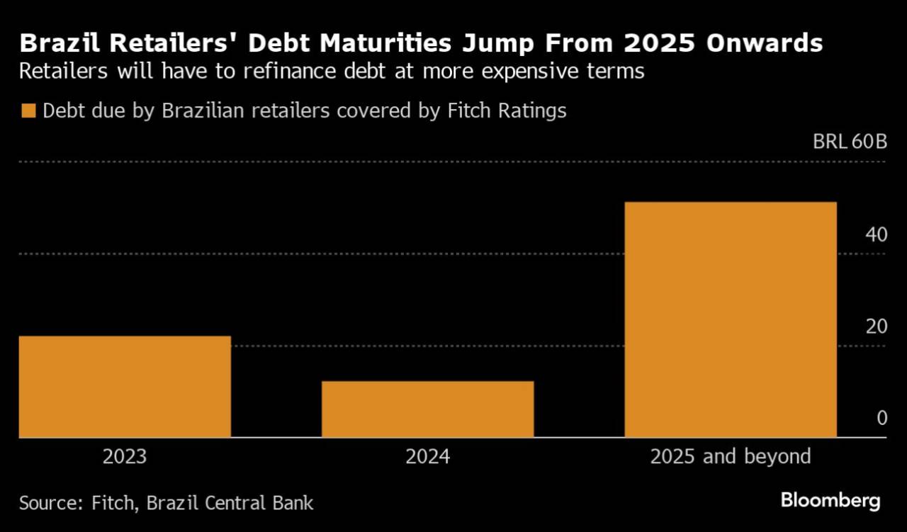 Os varejistas brasileiros aumentaram os seus níveis de endividamento nos anos anteriores à pandemia, aproveitando a queda das taxas de juro e a forte procura local pelos seus títulos. Um grupo de empresas de varejo brasileiras cobertas pela Fitch Ratings tinha cerca de R$ 34 bilhões em bonds com vencimento entre 2023 e 2024, e mais de R$ 51 bilhões com vencimento em 2025 e além.