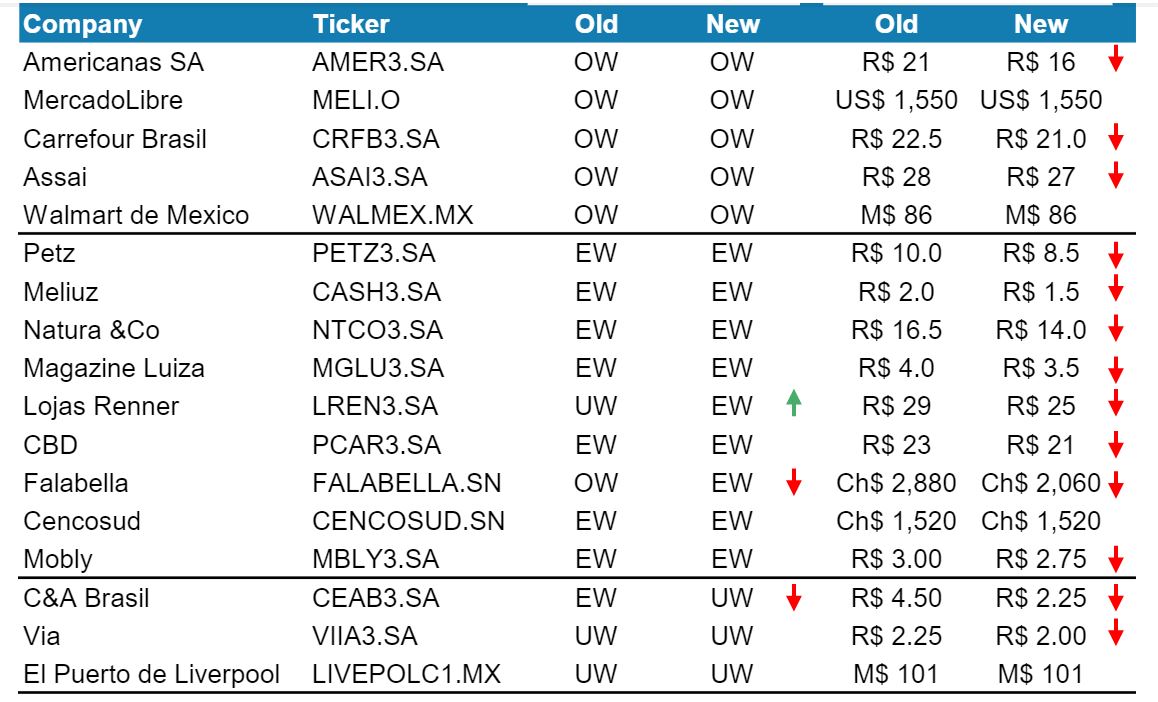 Confira abaixo as revisões para varejistas do Morgan Stanley (UW corresponde a underweight, EW a equalweight e OW a overweight):