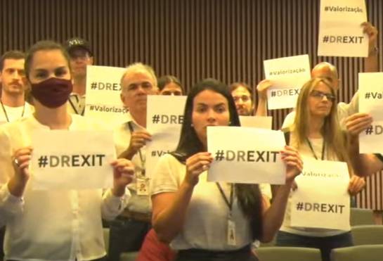 Servidores do Banco Central fizeram um protesto silencioso, mas visual, durante o Encontro Anual Drex 2023, que ocorreu nesta quinta-feira (7) em Brasília, sede do órgão no país. Com cartazes onde se liam as hashtags “valorização” e “Drexit”, os profissionais reivindicaram melhores salários e progressão de carreira, considerada assimétrica em comparação a outras posições do funcionalismo público federal.