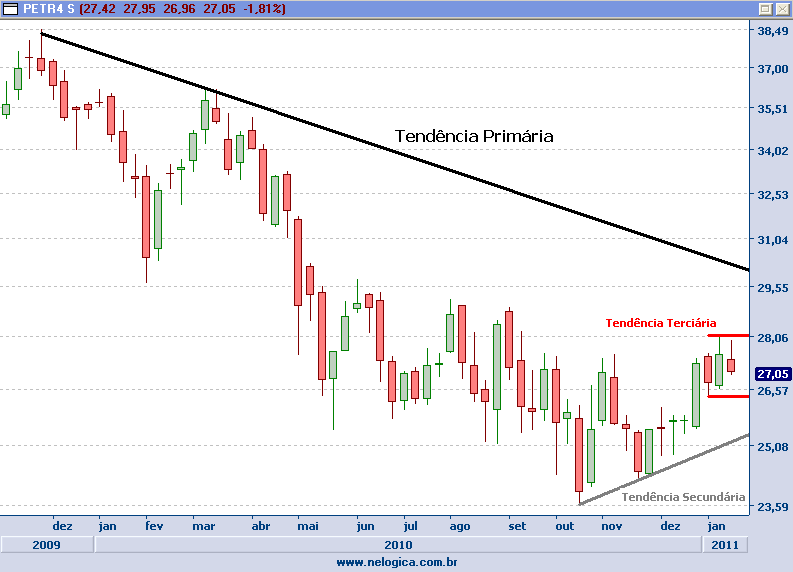 - Terciária: seguindo tal lógica, consiste na parada temporária da tendência secundária. Esta tem duração de poucos dias até três semanas (curtíssimo/curto prazo), acompanhada, principalmente nos gráficos de intraday, do gosto de swing traders mais agressivos e dos day traders.