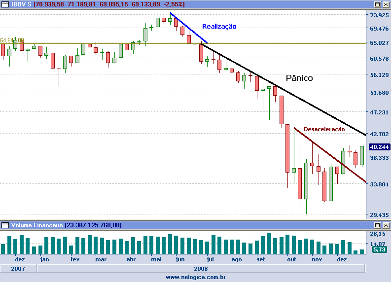 - Pânico: O peso das posições vendidas dos profissionais do mercado, que só aumenta à medida que importantes suportes vão sendo perdidos, começa influenciar na tendência secundária, gerando um sinal de alerta. Neste momento, grafistas e trend followers estão majoritariamente vendidos, ao mesmo tempo em que não se encontram grandes players na ponta da compra e a tendência primária reverte, trazendo pânico. A partir deste ponto, o volume cresce consideravelmente, e a queda, antes gradual, ganha muita velocidade.