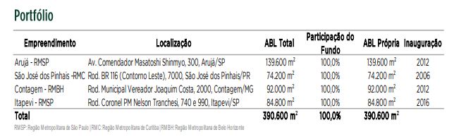 Atualmente, o portfólio do fundo é composto por quatro imóveis nos Estados de São Paulo, Minas Gerais e Paraná. Juntos, os espaços somam uma ABL de 390 mil metros quadrados. A vacância do fundo está em 0,5%.