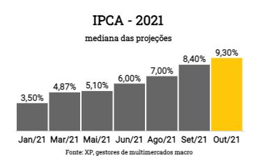 Com relação à inflação medida pelo Índice Nacional de Preços ao Consumidor Amplo (IPCA), as estimativas foram elevadas de 8,40%, em setembro, para 9,30%, em outubro. Antes da primeira reunião do Copom do ano, em janeiro, a projeção mediana para o IPCA era de 3,50% para 2021.
