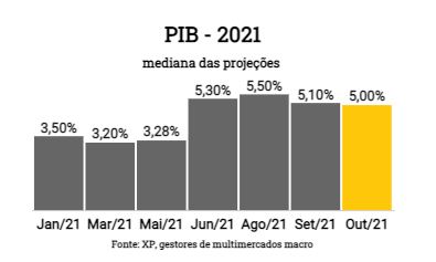 Para o Produto Interno Bruto (PIB), os gestores consultados veem agora um crescimento de 5% este ano, ante projeção de expansão de 5,10% da economia na pesquisa anterior.