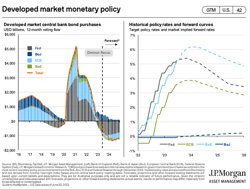 O quadro da política monetária no mundo ganhou muito destaque, tivemos movimentos coordenados de altas de juros e que devem permanecer mais altos por mais tempo, como sinalizam os gráficos abaixo: