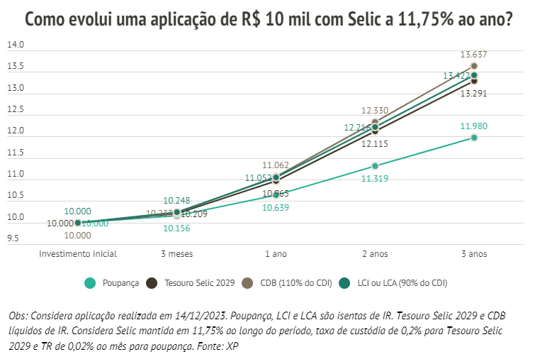 Assim, um investimento inicial de R$ 10 mil na poupança se transformaria em um montante de R$ 10.639 um ano depois – com a Selic em 12,25%, o valor final chegava a R$ 10.719, calcula Camilla, da XP.