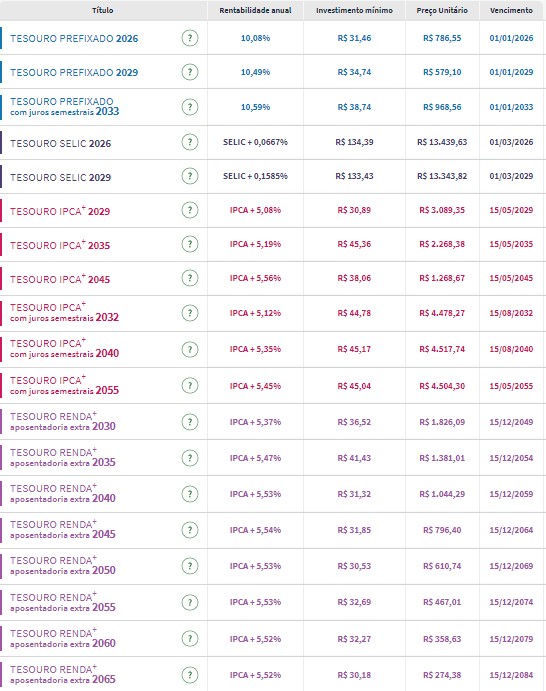 Confira os preços e as taxas dos títulos públicos disponíveis para compra no Tesouro Direto na tarde desta terça-feira (4):