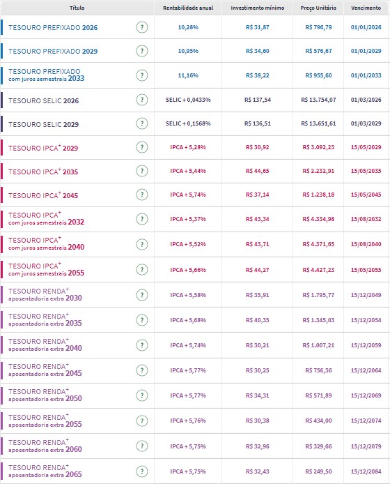 Confira os preços e as taxas dos títulos públicos disponíveis para compra no Tesouro Direto na manhã desta terça-feira (5):