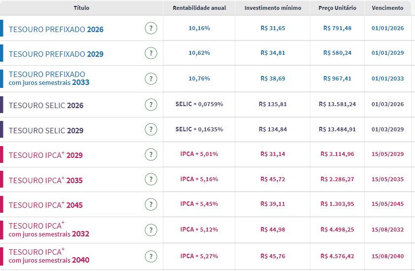 Confira os preços e as taxas dos títulos públicos disponíveis para compra no Tesouro Direto na manhã desta quarta-feira (2):