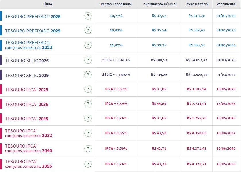 Confira os preços e as taxas dos títulos públicos disponíveis para compra no Tesouro Direto na manhã desta quarta-feira (22):