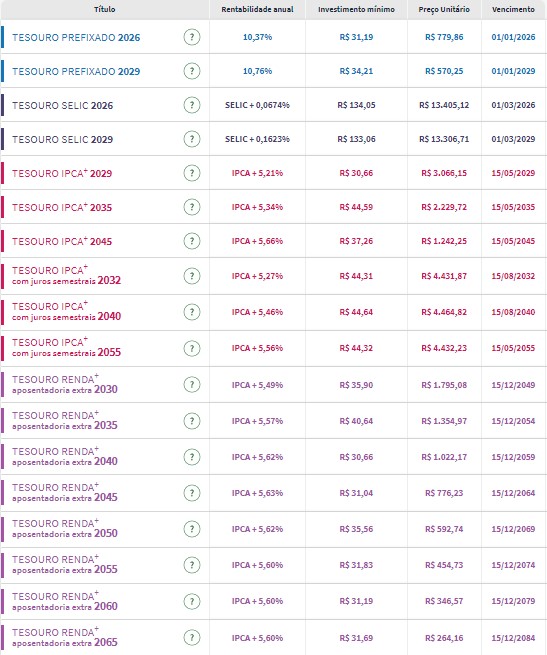 Confira os preços e as taxas dos títulos públicos disponíveis para compra no Tesouro Direto na tarde desta terça-feira (27):