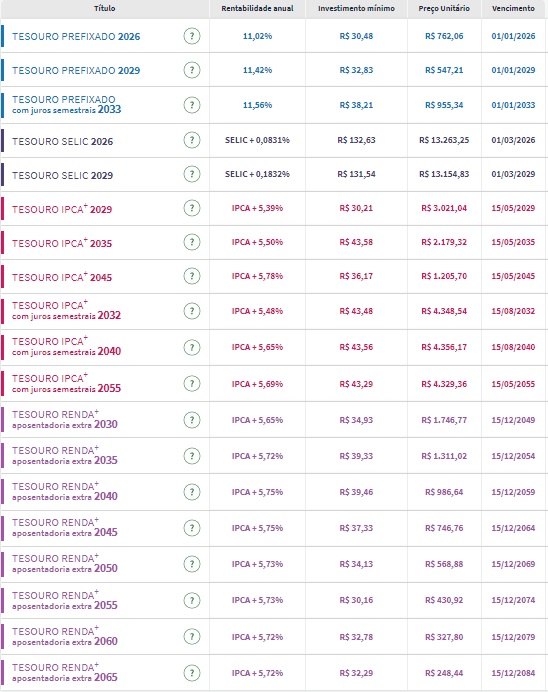 Confira os preços e as taxas dos títulos públicos disponíveis para compra no Tesouro Direto na tarde desta segunda-feira (29):