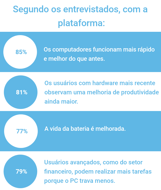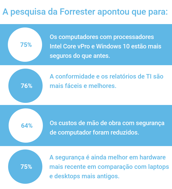 Para entender melhor os benefícios, custos e riscos potenciais associados a este investimento, a consultoria americana Forrester pesquisou em 2018 mais de 250 pessoas em organizações de médio porte em todo o mundo (na faixa de cerca de 100 a 1.000 funcionários) e entrevistou indivíduos em três organizações para validar os resultados da pesquisa e fornecer mais detalhes sobre a plataforma Intel vPro. Confira a seguir: