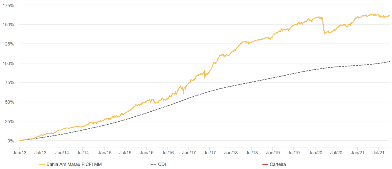 O Bahia AM Maraú rende cerca de 160% do CDI, desde seu início em 2013, como mostra o gráfico abaixo: