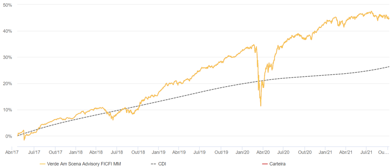 O Verde AM Scena Advisory rendeu cerca de 170% do CDI, desde seu início em 2017, como mostra o gráfico abaixo: