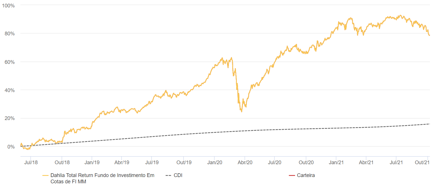 Na liderança ficou o Dahlia Total Return. Apesar da classificação como multimercado, o fundo é focado em ações no Brasil e no mercado internacional.