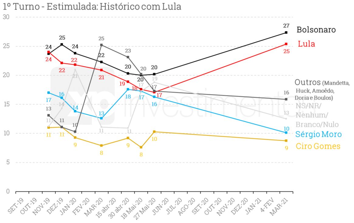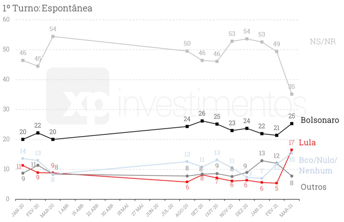 Segundo o levantamento, realizado entre os dias 9 e 11 de março, as intenções de voto de Lula saltaram de 17%, em maio de 2020, para atuais 25% em cenário estimulado de primeiro turno (quando o eleitor escolhe seu candidato entre opções apresentadas pelo entrevistador).