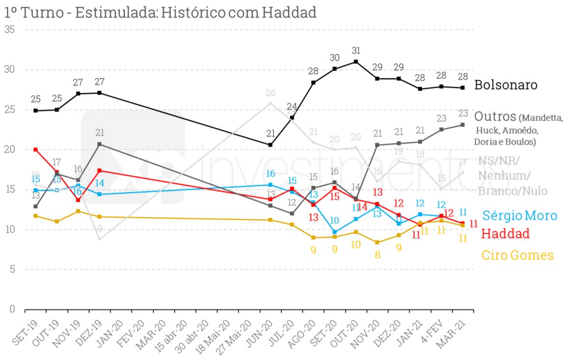 O levantamento mostra que o ingresso de Lula na disputa reduz de forma significativa a vantagem de Bolsonaro e diminui a possibilidade de nomes de outros partidos irem ao segundo turno. Em outra simulação, com o ex-prefeito paulista Fernando Haddad como representante petista, Bolsonaro tem “gordura” de 17 pontos percentuais. E Haddad aparece empatado com Moro e Ciro, todos com 11%.