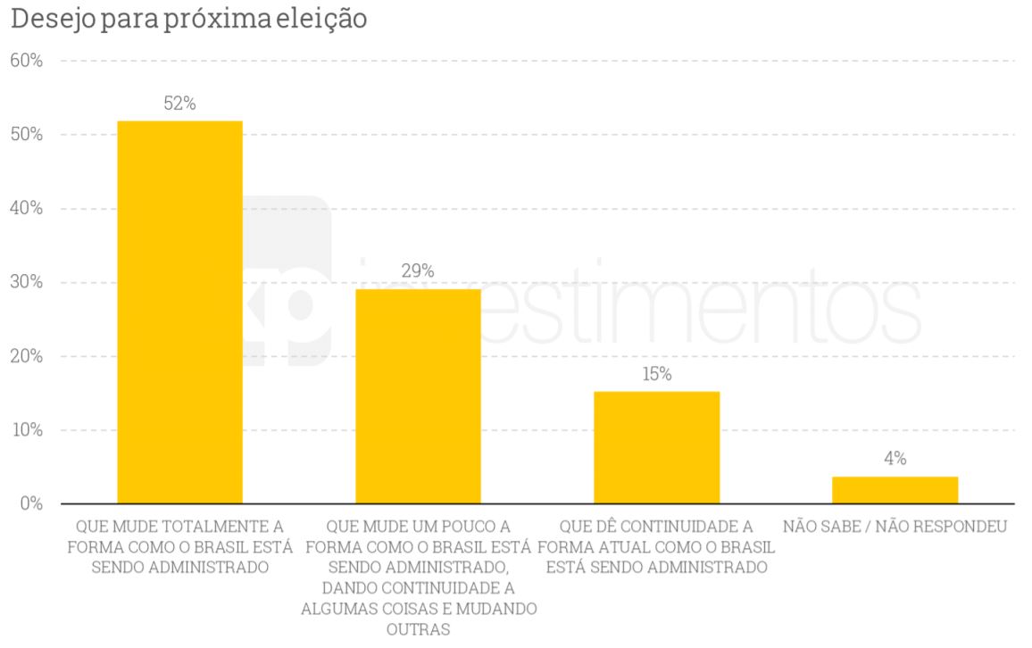 Quando questionados sobre o próximo presidente, 52% dizem preferir votar em um candidato que “mude totalmente a forma como o Brasil está sendo administrado”. Outros 29% dizem preferir alguém que “mude um pouco”, 15% “que dê continuidade à forma atual”.