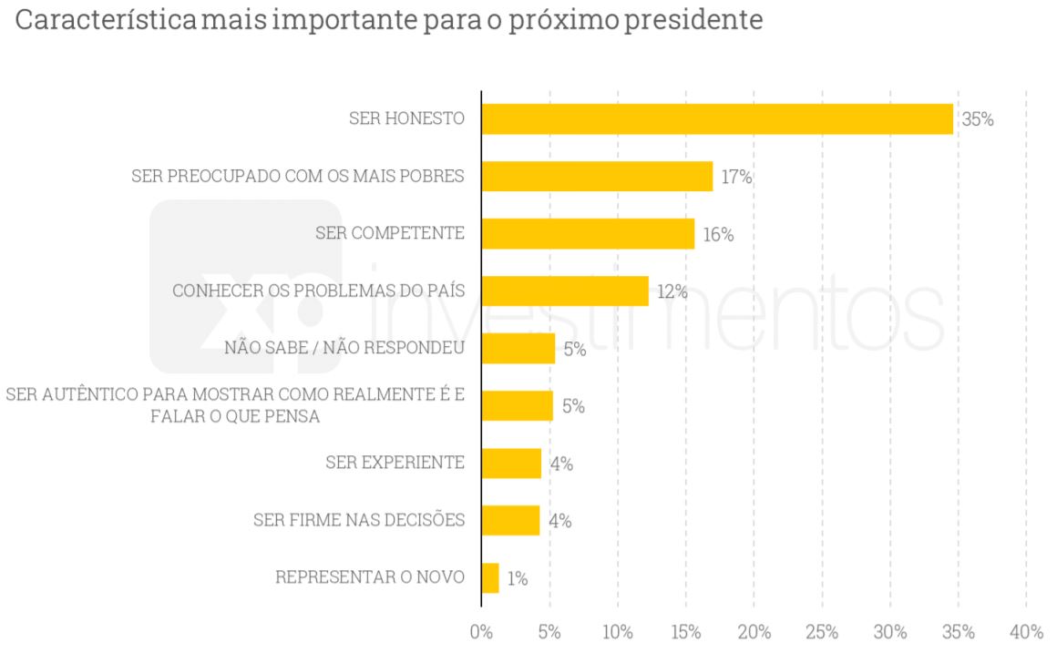 Para a maioria dos eleitores ouvidos (35%), a característica mais importante do próximo presidente será a honestidade. Na sequência, aparecem a preocupação com os mais pobres (17%), a competência (16%) e o conhecimento dos problemas do país (12%). A representação de renovação política, por outro lado, foi apontada por apenas 1%.