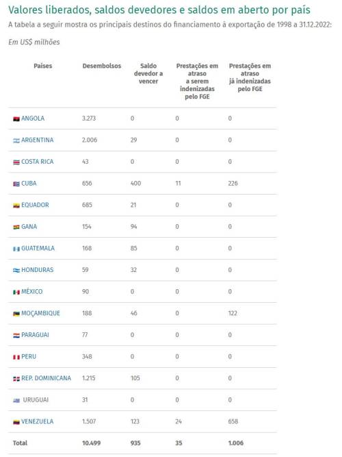 Segundo dados do BNDES, atualmente há US$ 935 milhões em saldo a vencer referente a obras realizadas na Argentina, em Cuba, no Equador, em Gana, na Guatemala, em Honduras, em Moçambique, na República Dominicana e na Venezuela.
