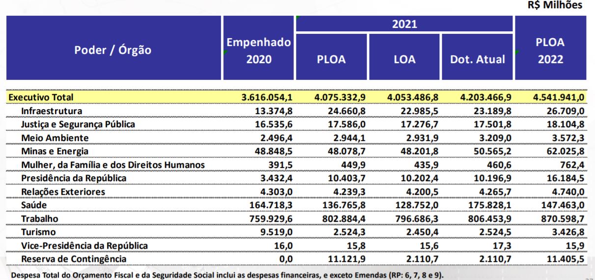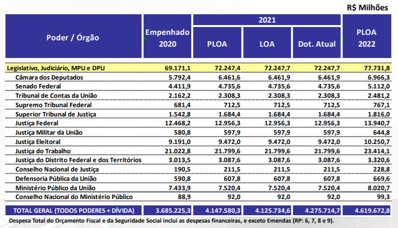 A indicação é resultado de R$ 2,01 trilhões de despesas primárias e R$ 1,96 trilhões de receitas primárias. O texto encaminhado ao parlamento também apresenta despesas de R$ 4,62 trilhões, referentes aos Três Poderes. Não foram consideradas receitas de privatizações, nem mesmo no caso da Eletrobras.