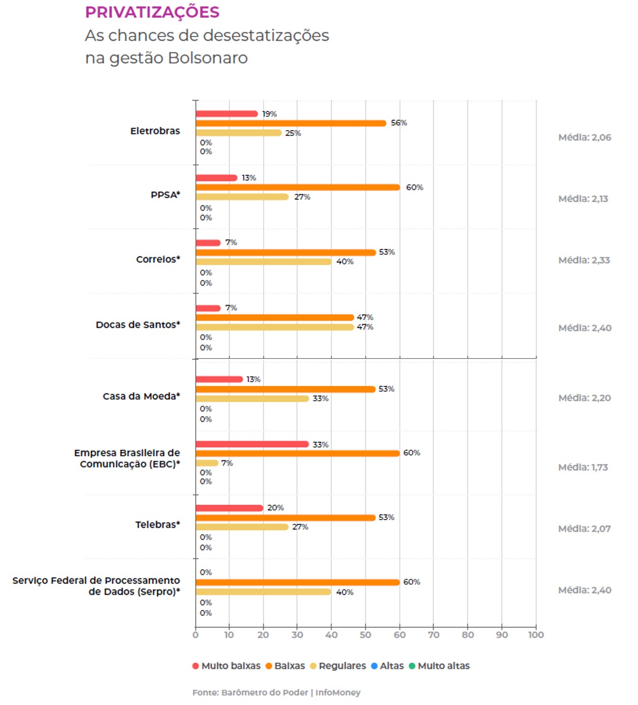 Um mês atrás, embora minoritários em todos os casos, alguns analistas atribuíam elevada probabilidade para as privatizações de Eletrobras (14%), PPSA (15%), Correios (15%), Docas de Santos (15%), Casa da Moeda (15%) e Serpro (8%).