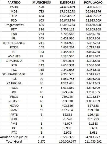 Aliás, nas capitais o DEM também se destaca. São quatro eleitos, contra apenas um quatro anos atrás. Além de ter conquistado Salvador, com Bruno Reis, Curitiba, com Rafael Greca, e Florianópolis, com Gean Loureiro, direto no primeiro turno, o partido agora levou o Rio de Janeiro, com Eduardo Paes. São 24.432.792 governados – número que pode subir para 512.902, dependendo do resultado em Macapá (AP), que teve o pleito adiado por conta dos problemas de fornecimento de energia elétrica que duraram mais de duas semanas.