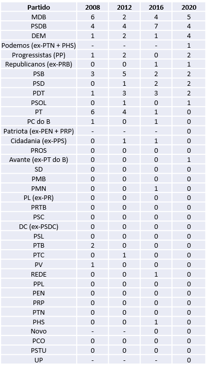 Outra novidade foi o ingresso do DEM no G5. A legenda foi a que mais conquistou prefeituras em comparação com o pleito de 2016: 196, um crescimento de 73%. Com o salto, o partido de Rodrigo Maia (RJ) e Davi Alcolumbre (AP) se aproximou do PSDB (520), que perdeu 279 prefeituras após um salto de 15% quatro anos atrás, embalado pelo impeachment de Dilma Rousseff (PT). A sigla de João Doria foi a que mais perdeu municípios.