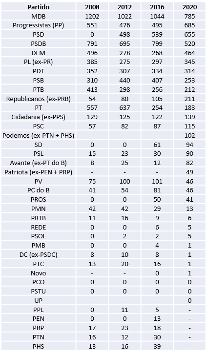Veja a evolução do quadro partidário nas últimas quatro eleições: