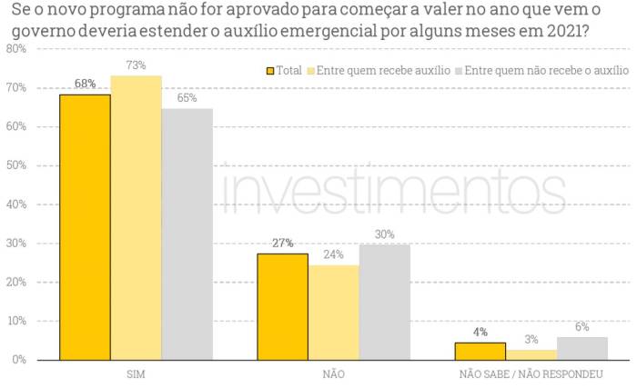 Segundo o levantamento, realizado entre os dias 8 e 11 de outubro, se o novo programa não for aprovado para começar a valer no ano que vem, 68% dizem ser a favor do que seria a terceira renovação do auxílio, criado para socorrer desempregados, trabalhadores informais, autônomos e beneficiários de programas sociais do governo federal diante dos efeitos da pandemia do novo coronavírus.
