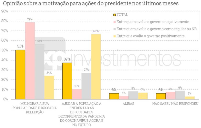 Na avaliação de 37% dos entrevistados, a motivação para as ações de Bolsonaro tem sido ajudar a enfrentar dificuldades decorrentes da pandemia agora e no futuro. O percentual chega a 67% entre os apoiadores do presidente e cai para 10% entre os críticos.